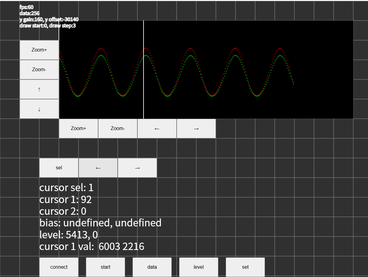 for (i=0; i<REC_SIZE; i++){ for (ch=0; ch<CH_NUM; ch++){ val = dataBuf[ch][i]; HAL_UART_Transmit(&huart1, (uint8_t)(&val), 4, 100); } } - 受信側(JavaScript)